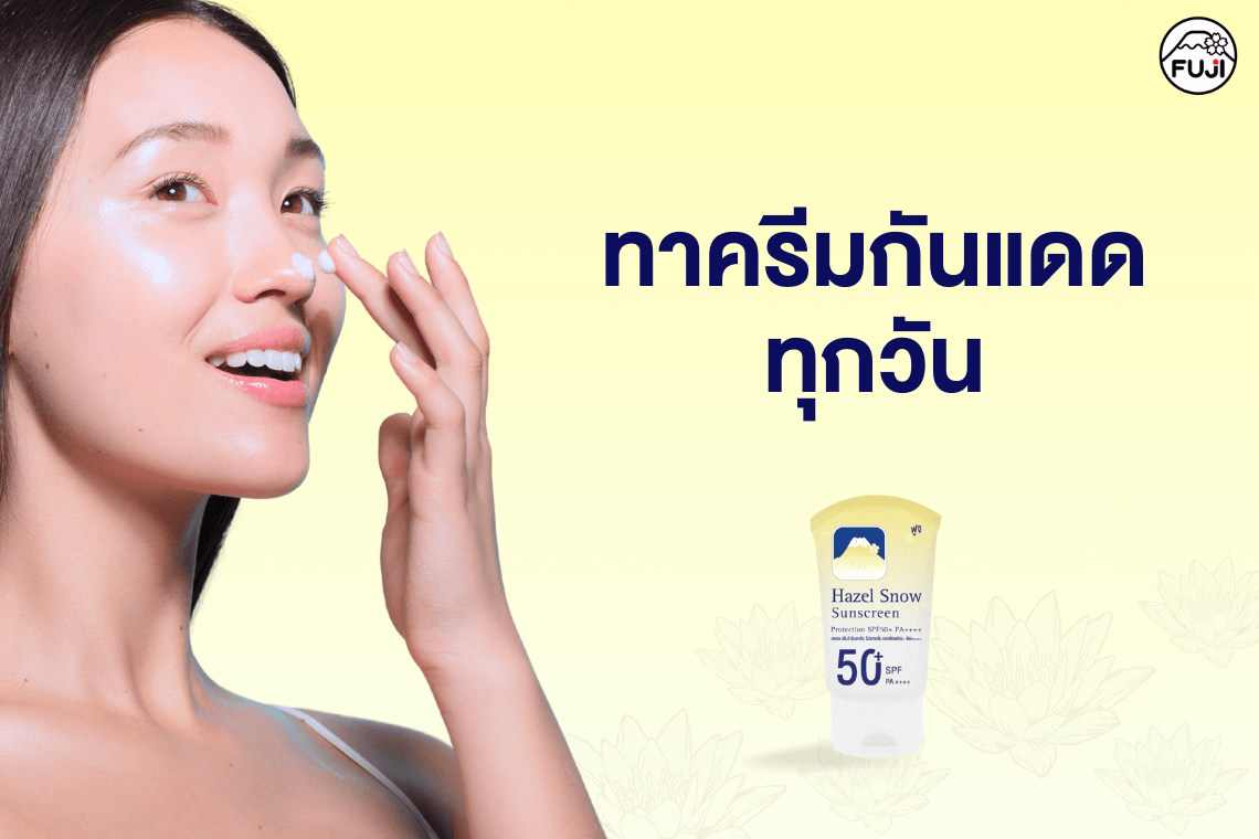 • ทาครีมกันแดดทุกวัน แม้ในวันที่ไม่มีแดด เพราะรังสี UVA สามารถทะลุผ่านเมฆและกระจกได้ โดยที่เราไม่ได้รู้สึกแสบรัอน