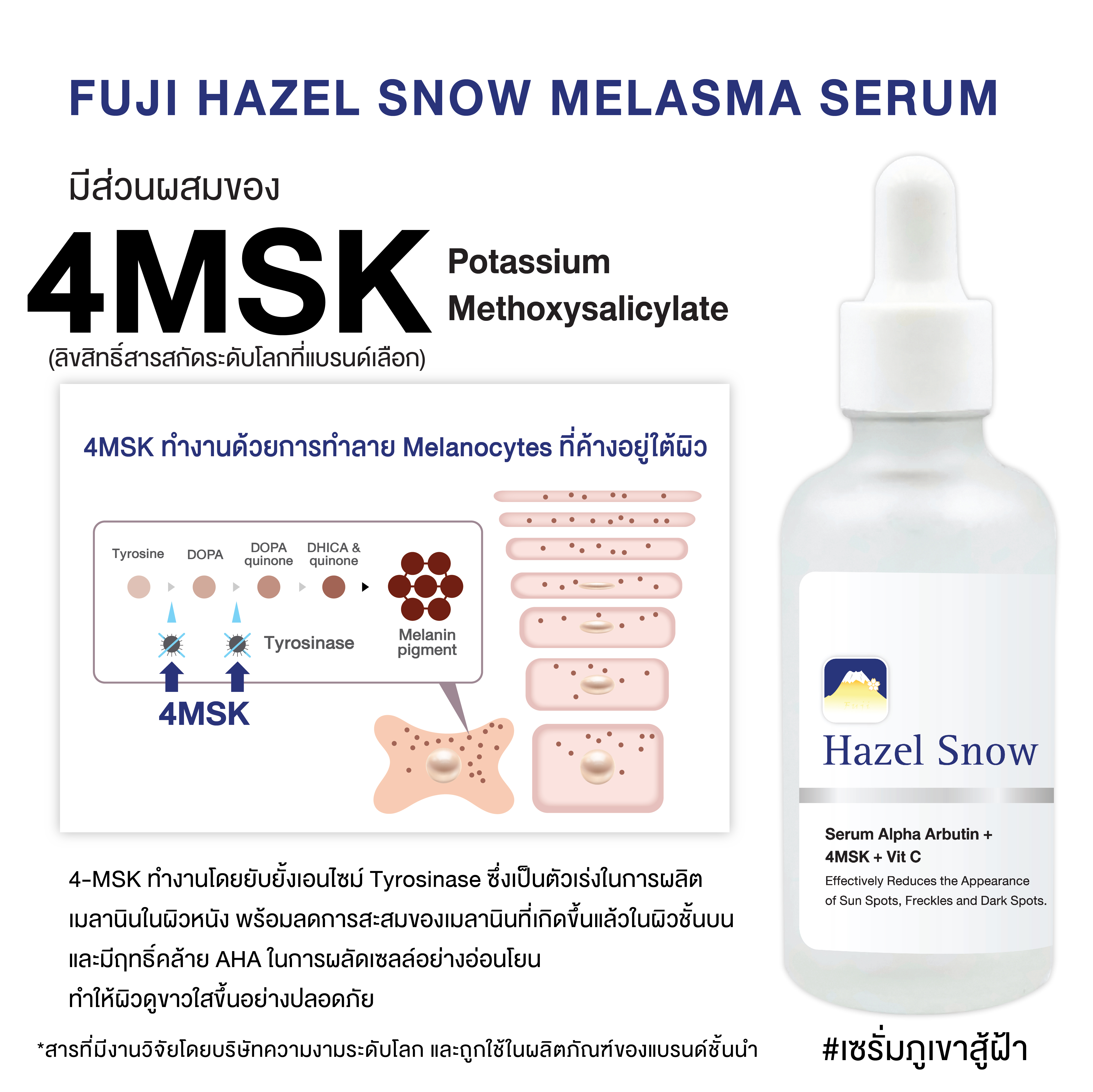 อย่างที่บอกไป 4-MSK ออกฤทธิ์ต่อเมลาโนไซต์และเคอราติโนไซต์ ยับยั้งการสร้างเม็ดสีเมลานิน นอกจากนี้ยังช่วยปรับผิวหน้าให้สม่ำเสมอ แทนที่ที่จะลดฝ้าเฉพาะจุดอย่างเดียว และที่สำคัญไม่ก่อให้เกิดอาการทางผิวหนังที่รุนแรง