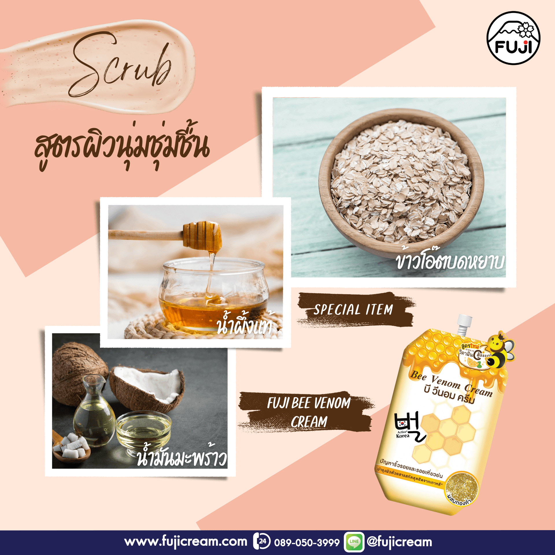 ขอแนะนำ ส่วนผสมพิเศษ! fuji bee venom cream ครีมพิษผึ้งผสมทองคำ ฟื้นฟูบำรุง ให้ผิวใสเด้ง! และยังมีวิตามินซีสูง ช่วยให้ผิวพรรณเด้งกระชับ และกระจ่างใส เติมลงในส่วนผสมสครับสูตรนี้ ช่วยกระตุ้นการเกิดคอลลาเจนให้กับผิว