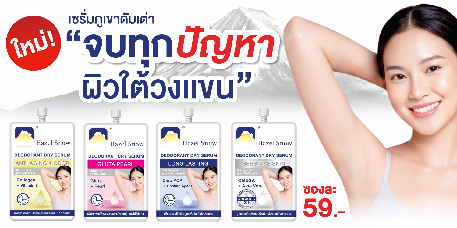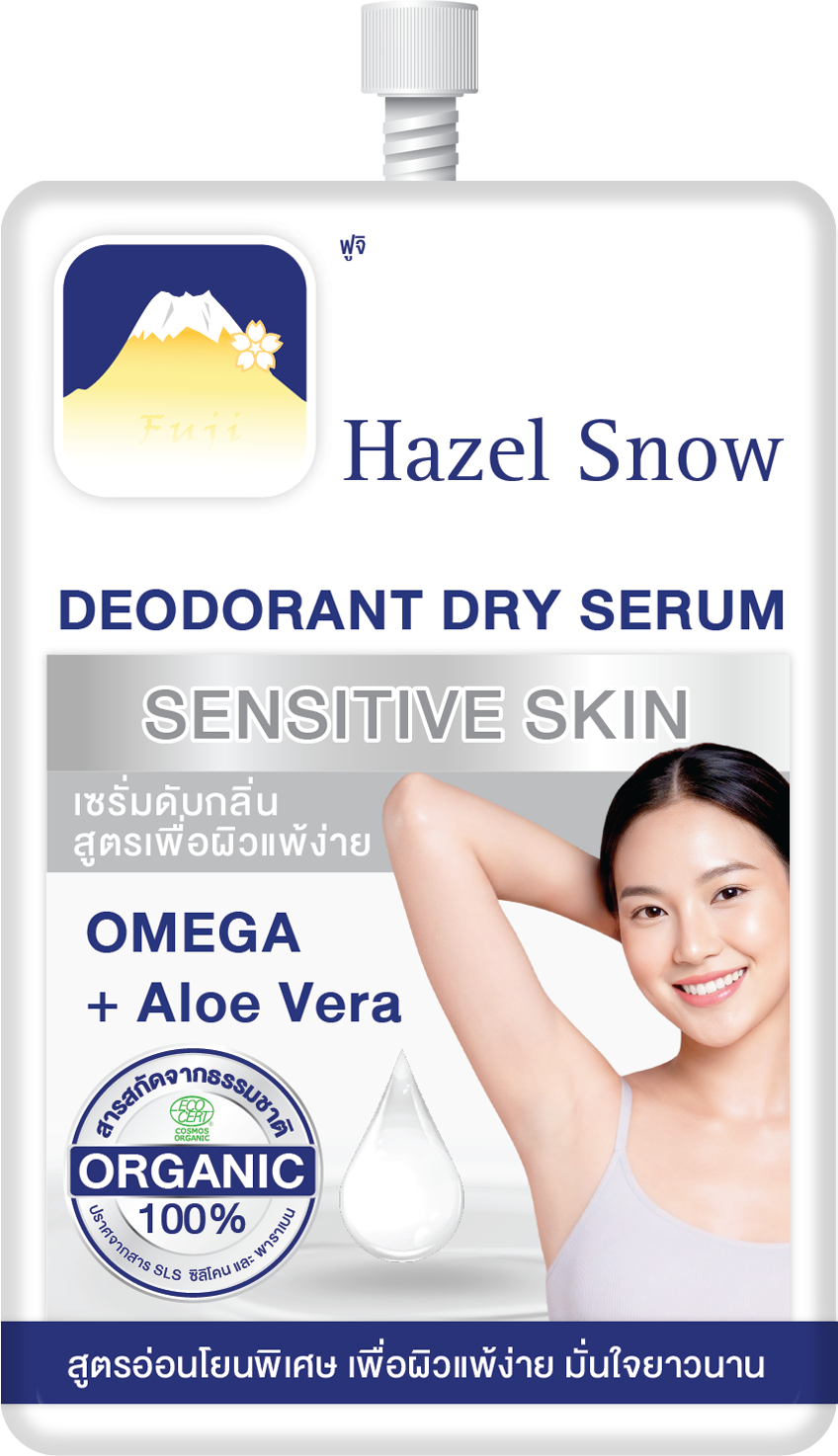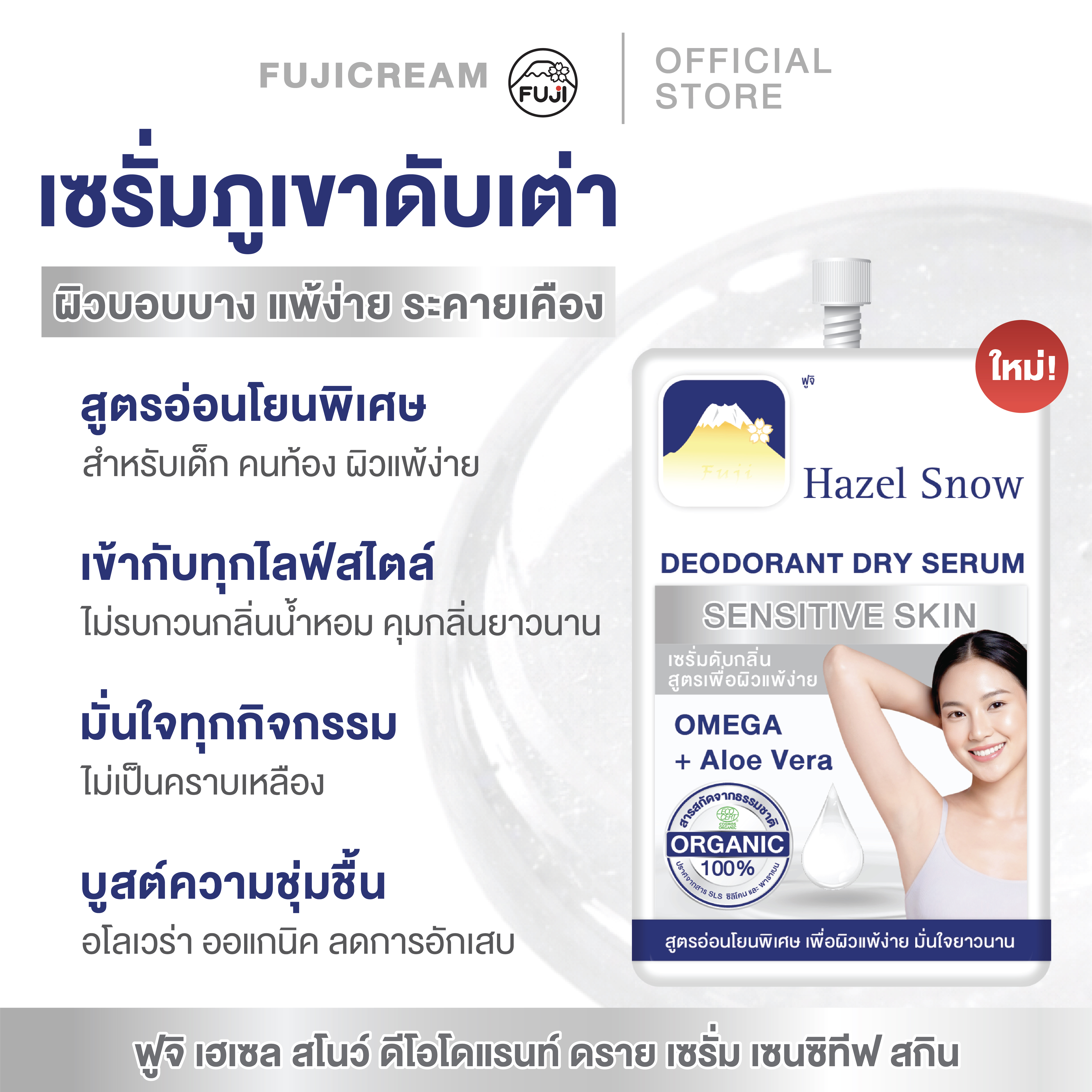 ฟูจิ เฮเซล สโนว์ ดีโอโดแรนท์ ดราย เซรั่ม เซนซิทีฟ สกิน ผลิตภัณฑ์เซรั่มระงับกลิ่นกาย จบทุก “ปัญหา” ผิวใต้วงแขน สูตรสำหรับผิวแพ้ง่าย ไม่มีส่วนประกอบของอะลูมิเนียม ไม่เป็นคราบเหลือง เนื้อครีมบางเบา แห้งไว ไม่เหนียวเหนอะหนะ สูตรอ่อนโยนพิเศษ สำหรับเด็ก คนท้อง ผิวแพ้ง่าย มั่นใจยาวนาน สูตรปราศจากสีและกลิ่นสังเคราะห์ ไม่ทำให้เกิดการแพ้ รักแร้ดำ/คล้ำ หรืออักเสบ ดับกลิ่นตัวยาวนาน ไม่อุดตันรูขุมขน