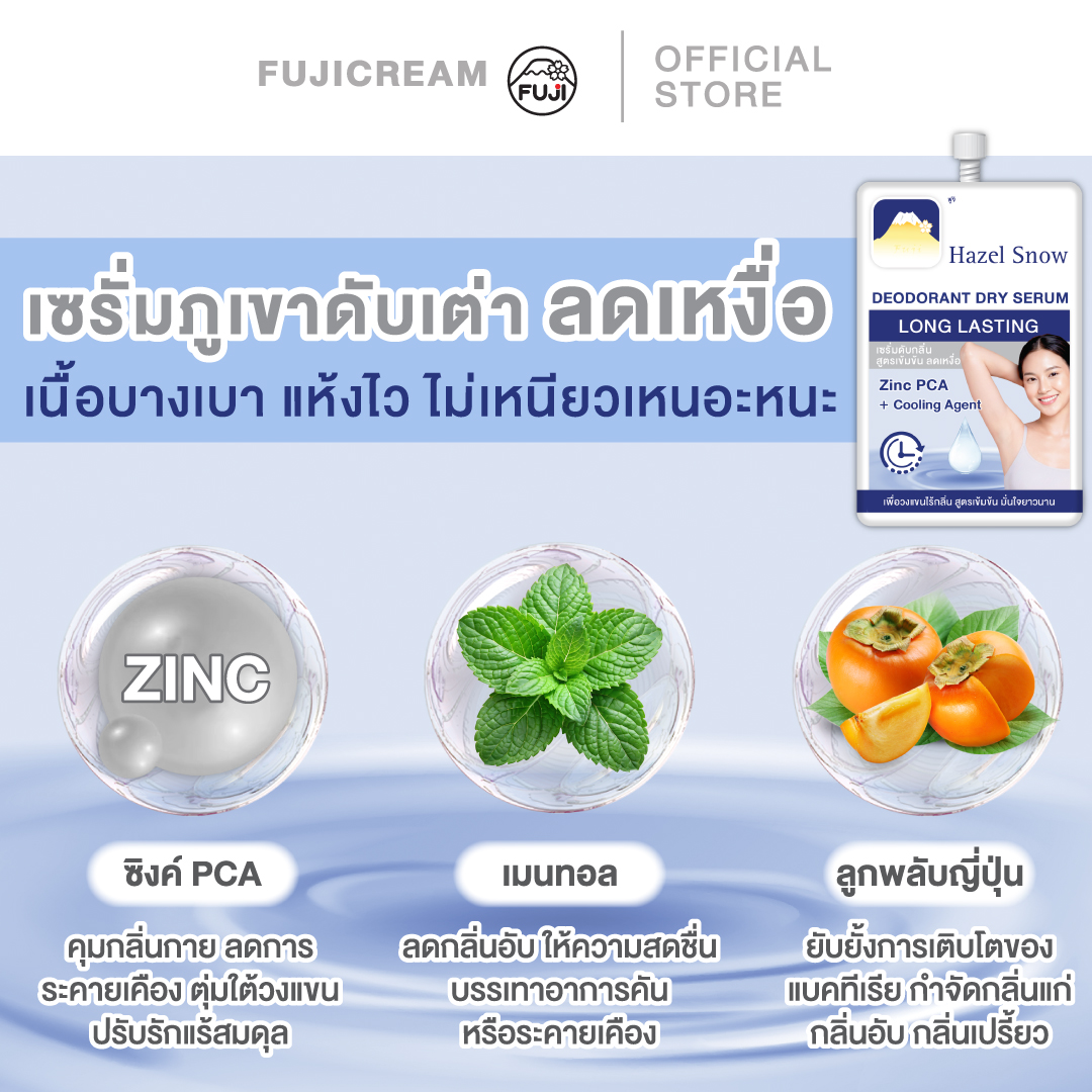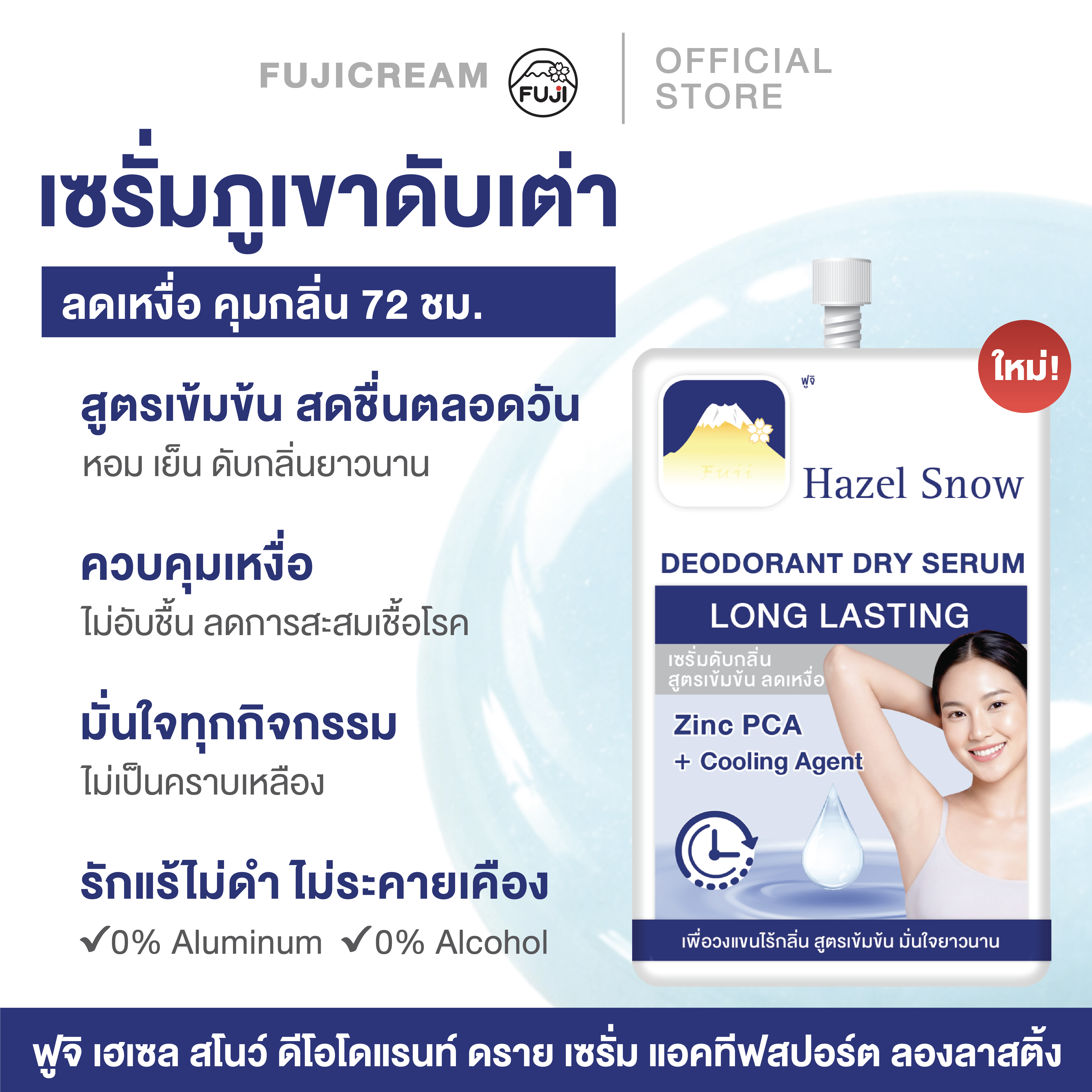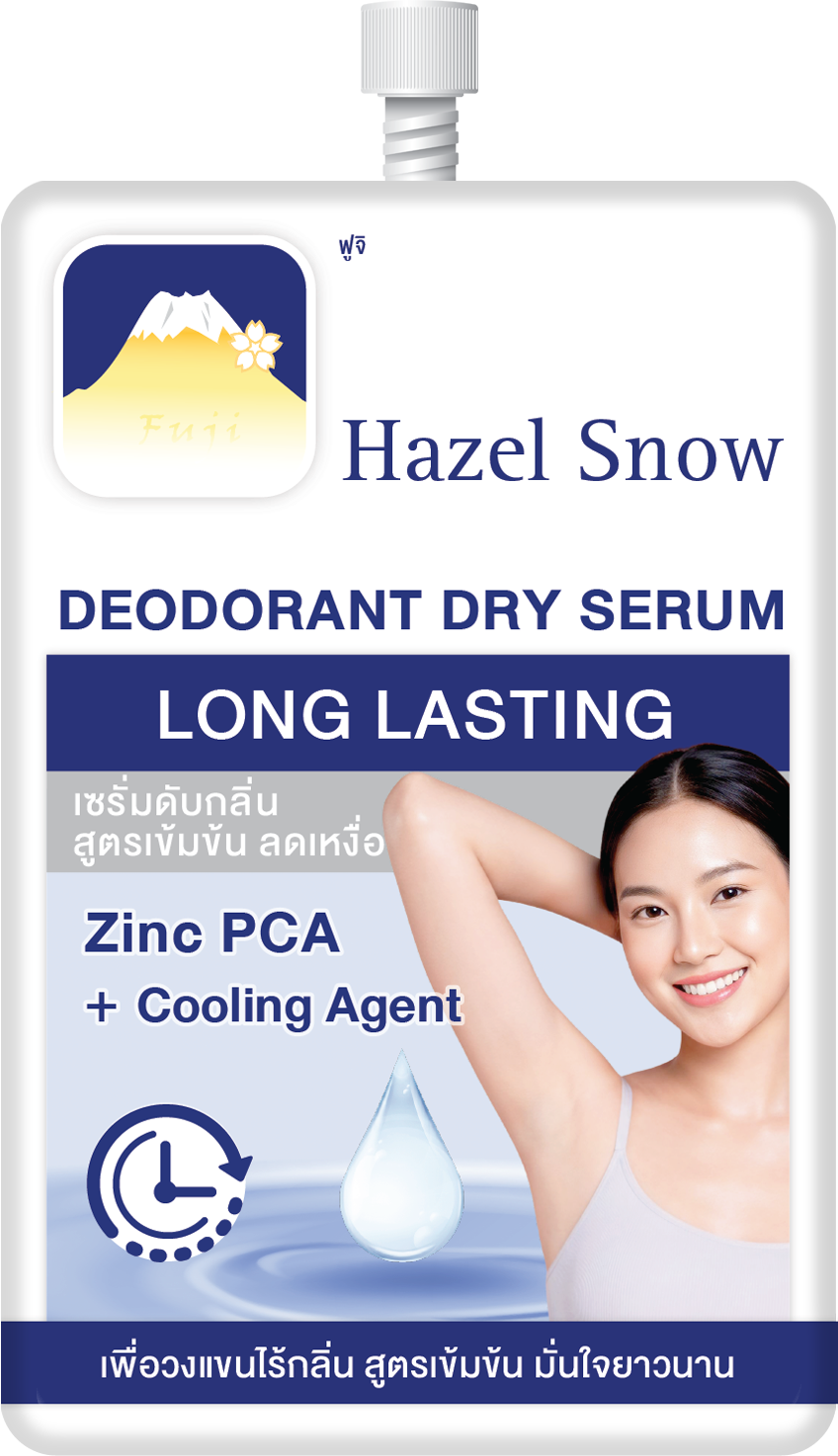 ฟูจิ เฮเซล สโนว์ ดีโอโดแรนท์ดราย เซรั่ม แอคทีฟสปอร์ต ลองลาสติ้ง ผลิตภัณฑ์เซรั่มระงับกลิ่นกาย จบทุก “ปัญหา” ผิวใต้วงแขน สูตรเข้มข้น ลดเหงื่อ ไม่มีส่วนประกอบของอะลูมิเนียม ไม่เป็นคราบเหลือง เนื้อครีมบางเบา แห้งไว ไม่เหนียวเหนอะหนะ ลดการหลั่งเหงื่อ ให้ความสดชื่น เย็นสบายทันทีหลังทา ควบคุมความมันใต้วงแขน ลดการหลั่งเหงื่อ แหล่งสะสมแบคทีเรีย เย็นสดชื่น ดับกลิ่นได้ยาวนาน 72 ชม. บูสต์ความชุ่มชื้น และให้ผิวยืดหยุ่น