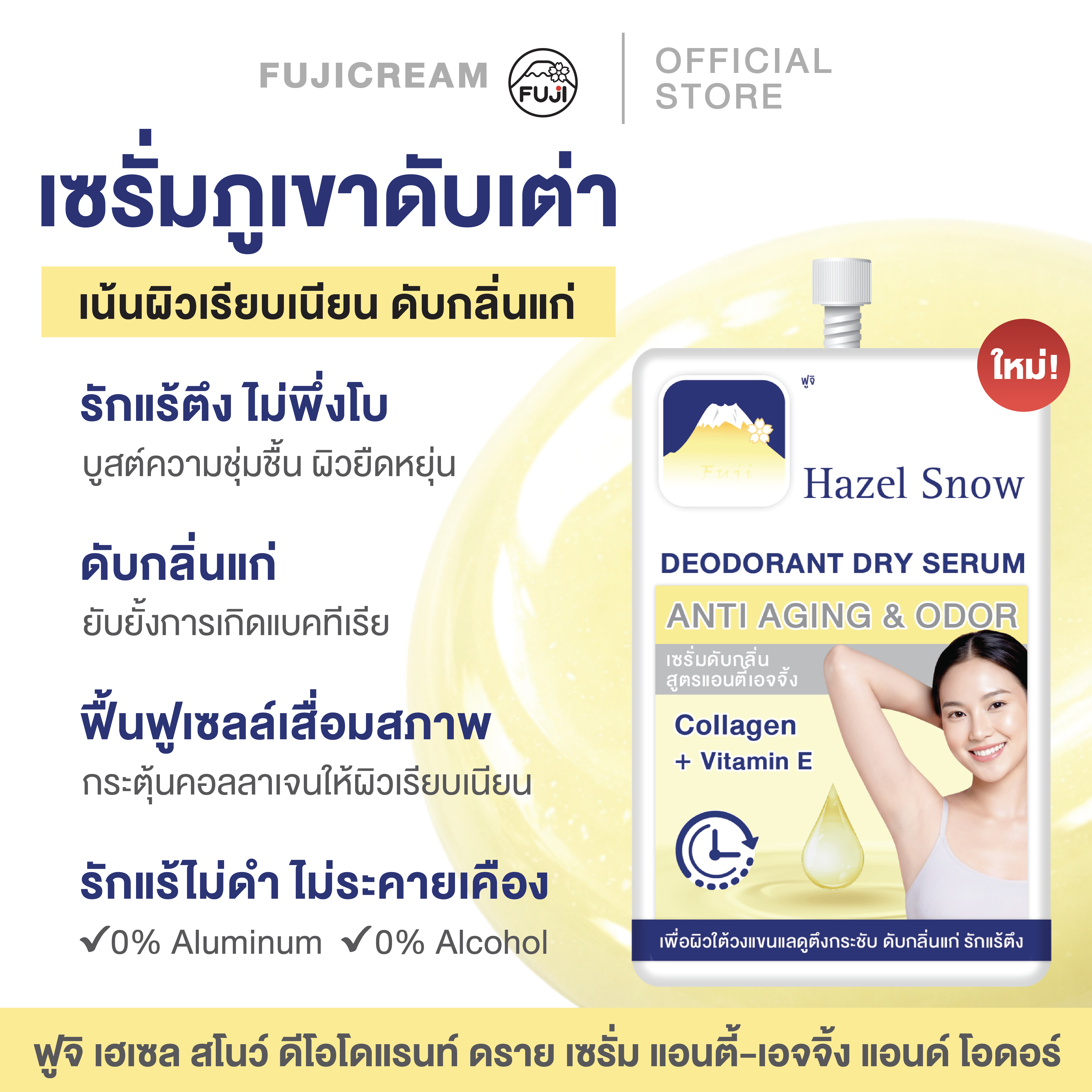 ฟูจิเฮเซล สโนว์ดีโอโดแรนท์ดราย เซรั่ม แอนตี้-เอจจิ้ง แอนด์โอดอร์ ผลิตภัณฑ์เซรั่มระงับกลิ่นกาย จบทุก “ปัญหา” ผิวใต้วงแขน สูตรแอนตี้เอจจิ้ง ไม่มีส่วนประกอบของอะลูมิเนียม ไม่เป็นคราบเหลือง เนื้อครีมบางเบา แห้งไว ไม่เหนียวเหนอะหนะ ผิวเรียบเนียน ดับกลิ่นแก่ ควบคุมการหลั่งเหงื่อ ลดการสะสมเชื้อแบคทีเรีย เพิ่มความชุ่มชื้นซึมเข้าสู่ชั้นผิวอย่างล้ำลึก ด้วยวิตามิน อี ฟื้นบำรุงวงแขนคล้ำดำเสีย รักแร้เหี่ยว